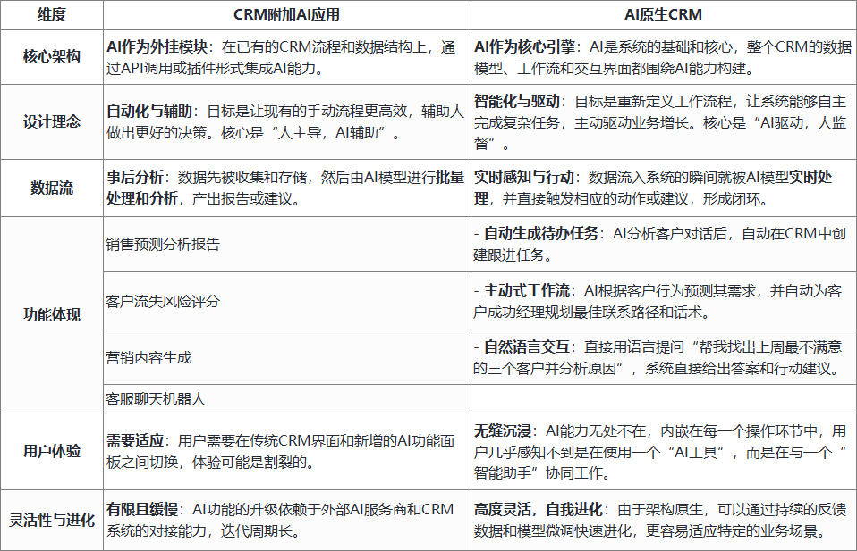 具体来说,AI原生的CRM在以下几个方面有着明确的区别于嵌入式AI的优势特点: