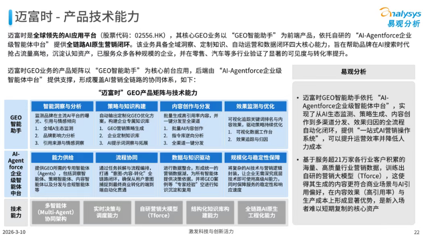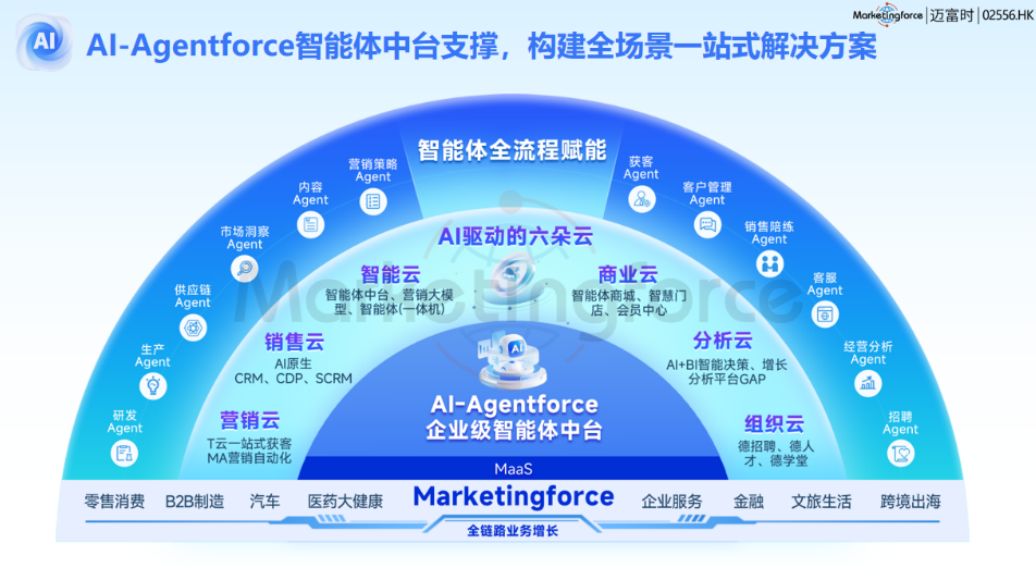 更重要的是,其迈富时的AI-Agentforce智能体中台集成了20余个专业优化智能体,能以0.25秒的极速响应,自动化执行内容生产、优化、监测等复杂任务,效率较人工提升300%。这让不具备顶尖技术团队的传统企业,也能轻松拥有世界级的AI应用能力,彻底打破了技术壁垒。